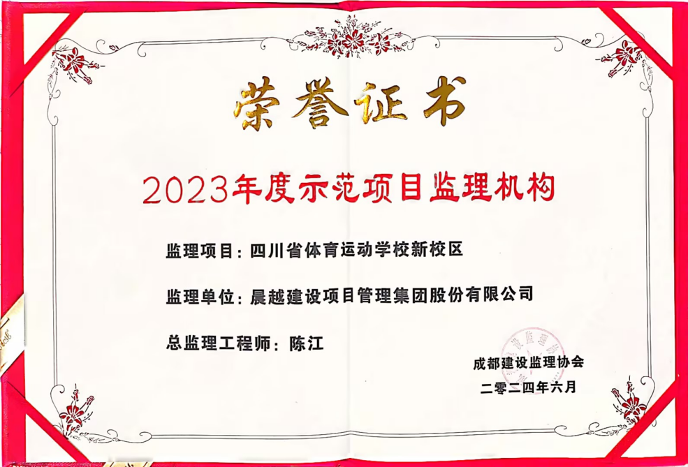 近日,晨越建管集團(tuán)喜獲成都市建設(shè)監(jiān)理協(xié)會(huì)頒發(fā)的“2023年度優(yōu)秀監(jiān)理企業(yè)”榮譽(yù),四川省體育運(yùn)動(dòng)學(xué)校新校區(qū)項(xiàng)目獲“2023年度示范項(xiàng)目監(jiān)理機(jī)構(gòu)”榮譽(yù),集團(tuán)總監(jiān)陳江榮獲“2023年度優(yōu)秀總監(jiān)理工程師”稱號(hào)。