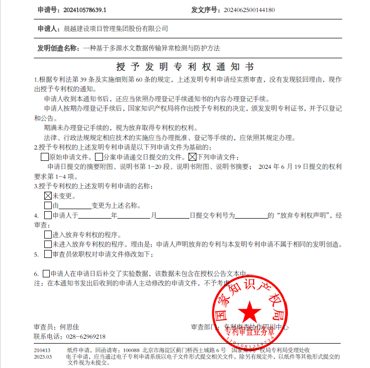 【晨越動態】集團獲得發明專利授權“水文數據傳輸異常檢測與防護方法“