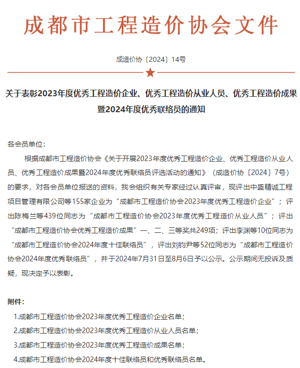 近日,成都市工程造價協會公布了“關于表彰2023年度優秀工程造價企業、優秀工程造價從業人員、優秀工程造價成果暨2024年度優秀聯絡員的通知”。