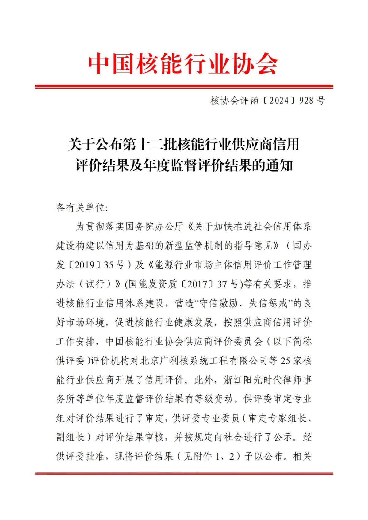 近日,中國核能行業協會公布第十二批核能行業供應商信用評價結果及年度監督評價結果,晨越建管集團獲得“中國核能行業協會供應商AA+信用等級評價”。