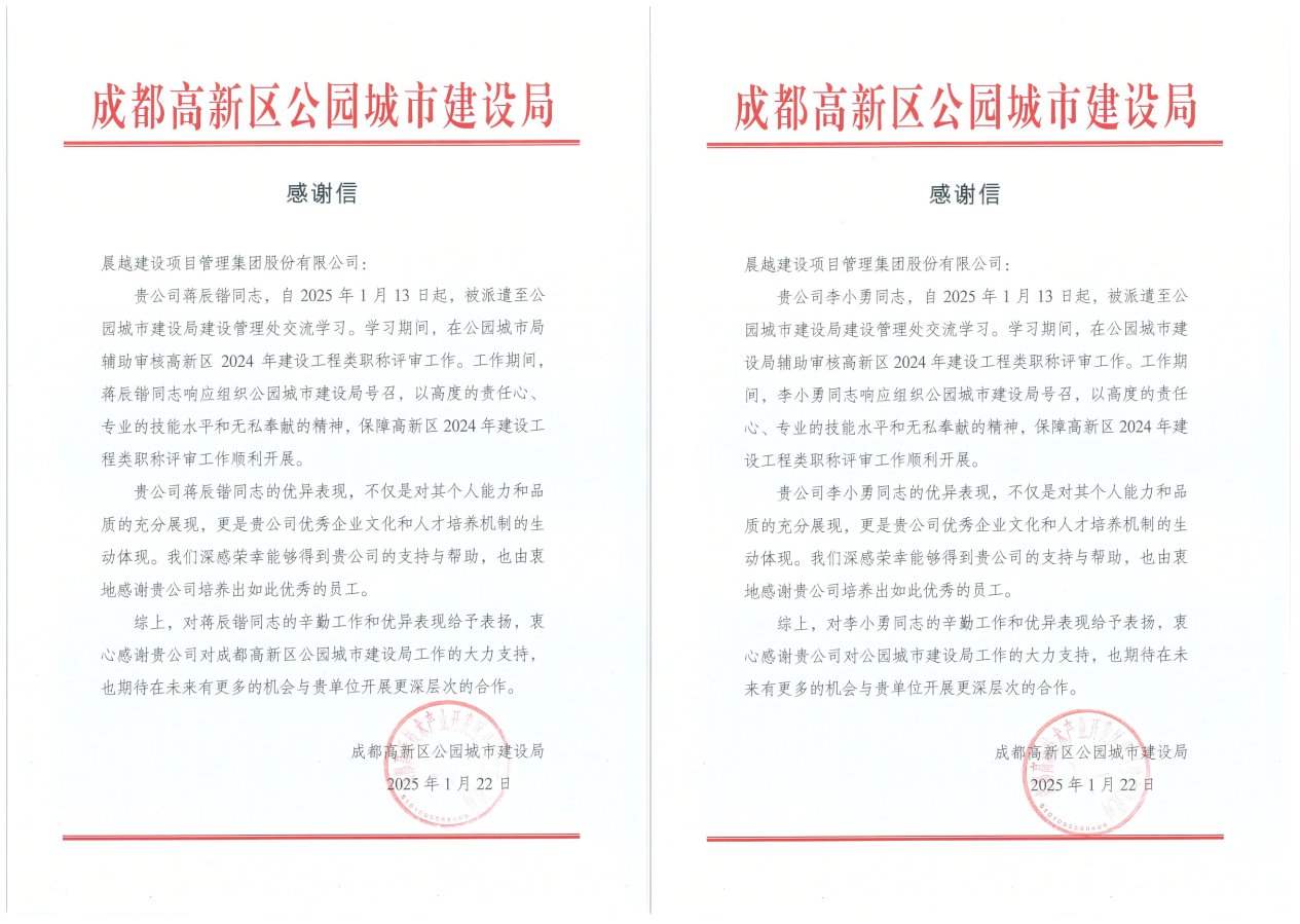 近日,晨越建管集團收到來自成都高新區公園城市建設局的《感謝信》,對集團員工李小勇和蔣辰鍇支持高新區2024年建設工程類職稱評審工作表示誠摯的感謝。