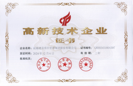 近日,晨越建管集團收到由四川省科學技術廳、四川省財政廳、國家稅務總局四川省稅務局聯合頒發的《高新技術企業證書》(證書編號:GR202451004397),發證時間:2024年12月06日,有效期:三年。