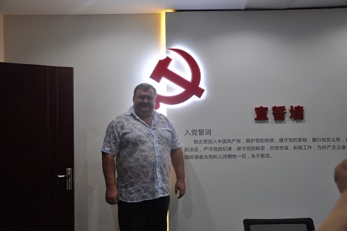 會談結束后,尤里•杜特切科先生來到公司黨員活動室,作為俄羅斯聯邦共產黨員的他站在共產黨宣誓墻前重溫了共產黨的入黨誓詞,隨后王董用普通話教尤里先生宣讀誓詞并高舉右手共同宣誓。