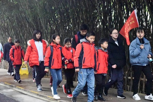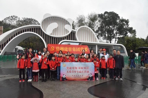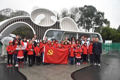 時值寒冬時節,臘梅飄香,細雨蒙蒙,元旦新年之際,黨旗、國旗迎風招展。晨越集團黨委、紀委3人,組織成都九中(樹德)外國語學校高中生11名、廣元市朝天區大灘鎮貧困小學生20名、兩校帶隊教師各5人,冒著寒風冷雨,興高采烈,匯聚到成都熊貓基地,開展愛國主義教育主題活動。