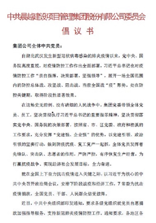 全國抗疫決戰時段,習總書記等中共中央政治局七常委向抗疫捐款,中組部、省市區黨委、黨工委、桂溪黨工委各級號召中共黨員捐款,晨越集團黨委立即響應,發出《倡議書》,組織全體黨員自愿捐款,大家積極行動,迅速落實,一個一個,接連不斷,獻上滿滿心意,短時間圓滿完成此次活動,及時將捐款繳入黨費專戶,上級層層繳入中央財政。
