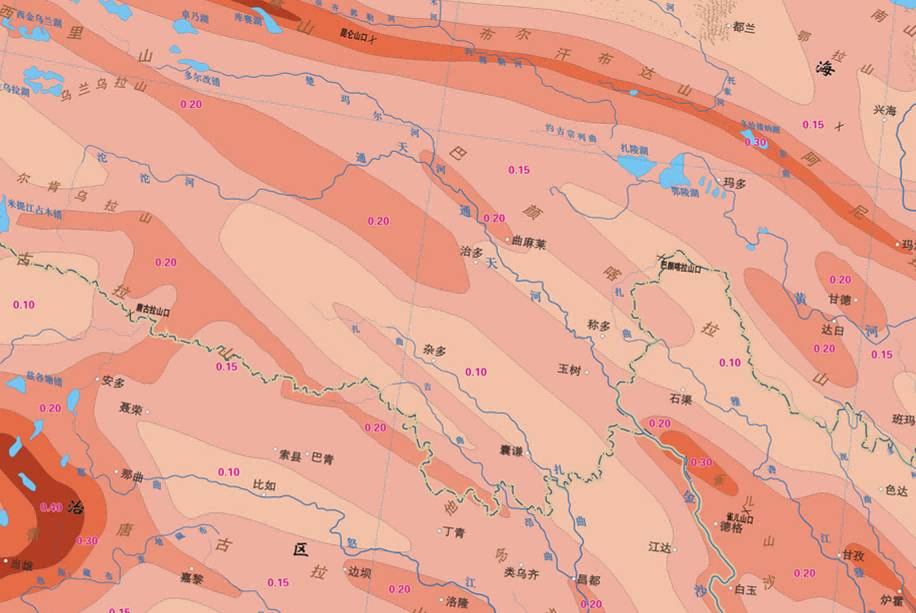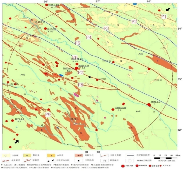 國慶水庫工程位于玉樹市果青溝西溝唐古拉準地臺北部的巴塘臺緣褶帶部位,主要河流有巴塘河和扎西科河,二者在結古鎮匯合后以下河段稱之為扎曲河,最終注入通天河,屬長江上游通天河水系。工程周邊主要由兩岸山地、河床灘地及坡地構成(如圖3-1所示)。由于本區域距兩個一級構造單元唐古拉準地臺分界的烏蘭烏拉湖~玉樹南深大斷裂帶(26km)和玉樹~甘孜斷裂帶(1.4km)較近(圖3-2、圖3-3)。