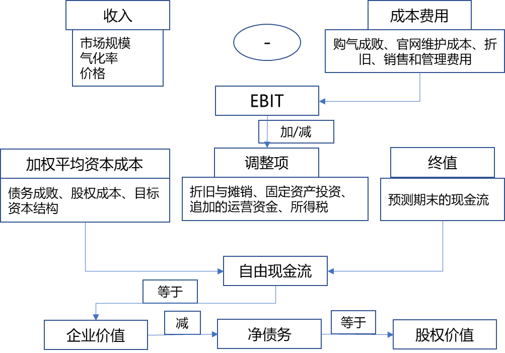 燃氣企業股權價值評估一般采用收益折現法。具體路徑如下圖: