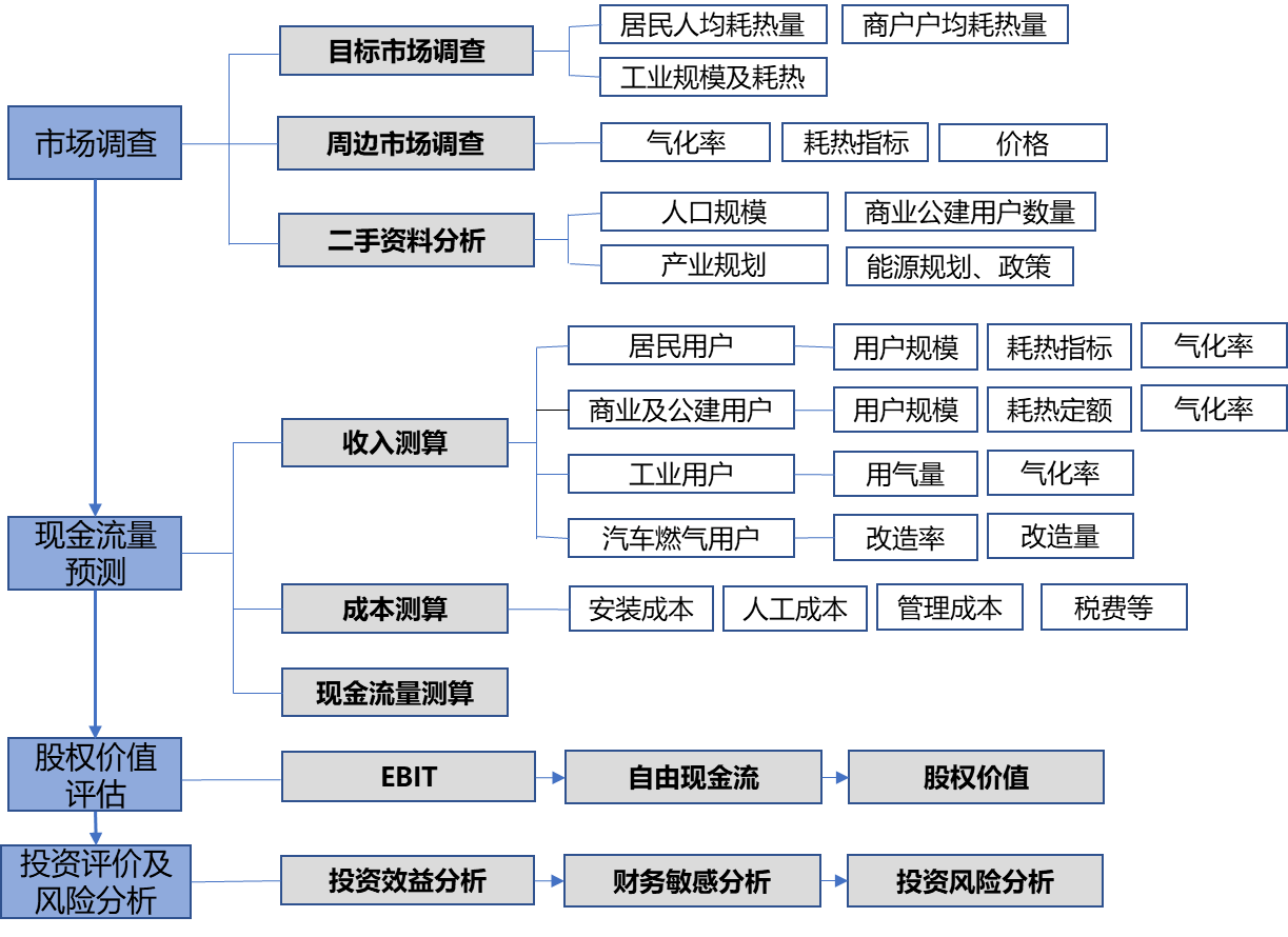 針對以上問題,本次解決思路是根據燃氣市場特點,采用市場調查與二手資料分析相結合方式,獲取項目基礎數據。在此基礎上,構建新開發燃氣市場收益預測模型,對企業未來的現金流進行預測。最后采用股權自由現金流量貼現模型對股權價值進行評估,并對股權收購價格、收購風險提出建議和意見。具體思路如下圖: