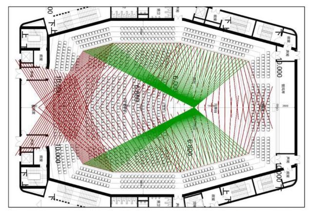 為滿足觀演廳的聲學(xué)標(biāo)磚,利用ODEON軟件,結(jié)合聲學(xué)裝飾BIM模型進(jìn)行觀演廳的三維聲場模擬分析。通過聲學(xué)反射分析結(jié)果對天花和墻面裝飾造型和材料優(yōu)化,調(diào)整觀眾席區(qū)域反射聲音的覆蓋范圍,使舞臺發(fā)出的聲音均勻分布在整個觀眾席區(qū)域內(nèi),達(dá)到理想聲學(xué)效果。