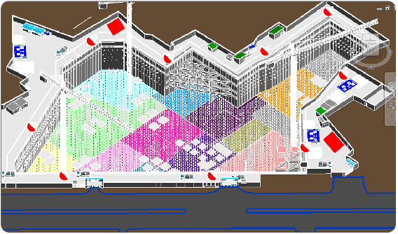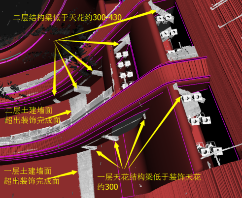 為避免精裝修與土建結(jié)構(gòu)的沖突碰撞,精裝修施工前對現(xiàn)場土建完成結(jié)構(gòu)進(jìn)行實(shí)測復(fù)核。通過三維激光掃描儀對觀演廳內(nèi)土建結(jié)構(gòu)進(jìn)行實(shí)測掃描,獲得廳內(nèi)三維點(diǎn)云數(shù)據(jù)模型,結(jié)合裝飾裝修的BIM模型,進(jìn)行主體結(jié)構(gòu)與裝飾設(shè)計造型的碰撞檢查。
