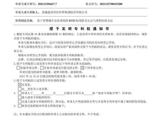 晨越建管統(tǒng)籌旗下企業(yè)技術(shù)中心、院士工作站等高端工程研發(fā)機構(gòu),共研“基于人工智能的智慧社區(qū)綜合服務(wù)平臺”項目,并成功申請發(fā)明專利《基于智慧城市安防系統(tǒng)的RFID標(biāo)簽?zāi)涿J(rèn)證與密鑰協(xié)商方法》。本發(fā)明的目的在于克服現(xiàn)有技術(shù)的一項或多項不足,提供一種基于智慧城市安防系統(tǒng)的RFID標(biāo)簽?zāi)涿J(rèn)證與密鑰協(xié)商方法,極大提升智慧安防系統(tǒng)的安全性、可靠性、穩(wěn)定性。本項目是企業(yè)技術(shù)中心、院士工作站在智慧城市建設(shè)領(lǐng)域的首次技術(shù)突破,將進(jìn)一步為集團(tuán)開拓智慧城市咨詢市場、深化信息化咨詢建設(shè)奠定基礎(chǔ)。