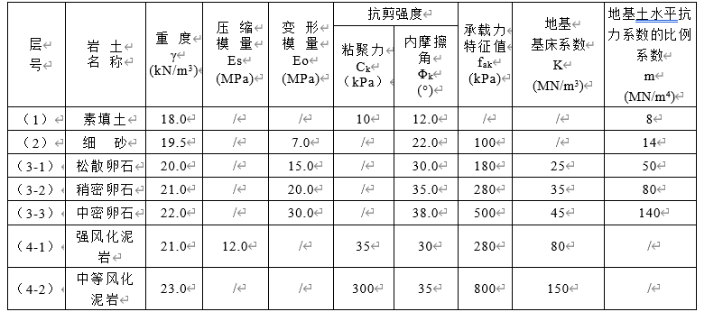 項(xiàng)目場(chǎng)地地勢(shì)平坦,地面高程為495.210~496.330m。根據(jù)地勘資料顯示,地下水靜止水位埋深為2.0~3.4m,根據(jù)區(qū)域水文地質(zhì)資料,場(chǎng)地潛水地下水位年變化幅度為1.5m~2.0m。本場(chǎng)地砂、卵石層為主要含水層。工程地質(zhì)情況如下表: