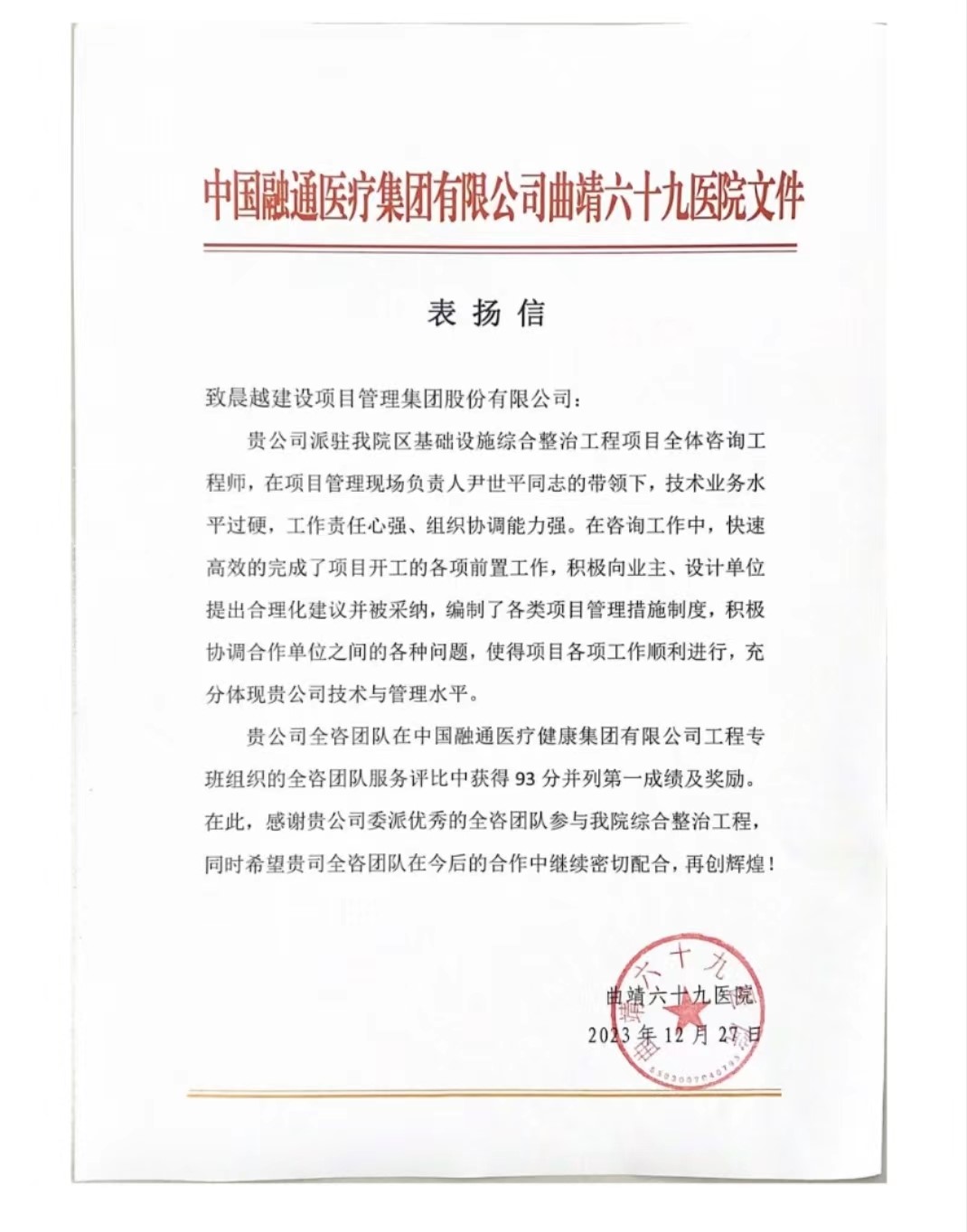 近日,晨越建管集團收到中國融通醫療集團有限公司曲靖六十九醫院《表揚信》,對集團及全咨項目團隊的技術與管理水平表示肯定,對項目部取得的成績給予表揚。