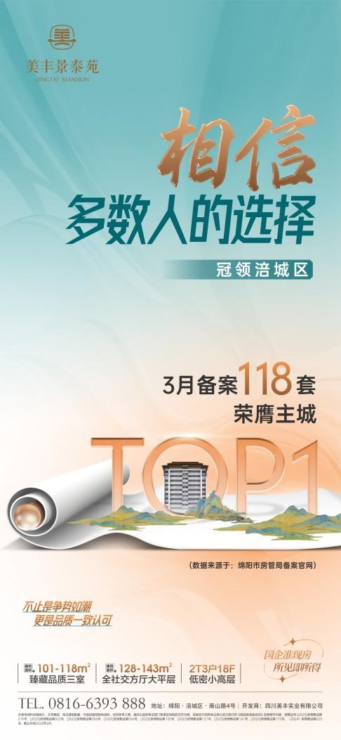 截至3月,美豐景泰苑住宅備案套數118套,獲綿陽主城TOP1!