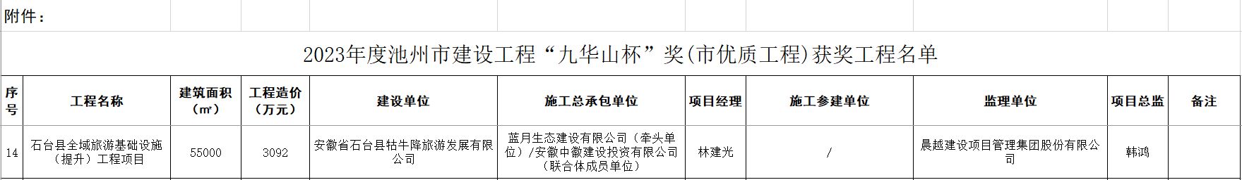 【晨越全咨】集團池州市石臺縣全域旅游基礎設施項目榮獲2023 年度池州市建設工程“九華山杯”獎(市優質工程)