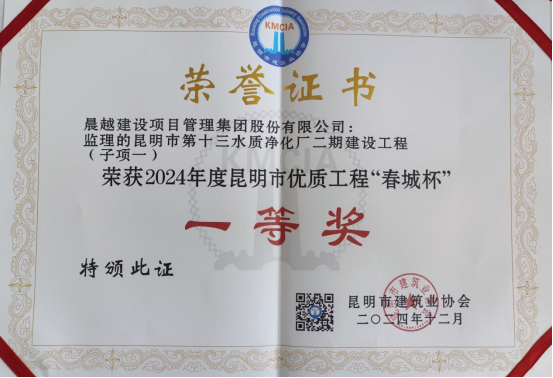 近日,由集團監理的昆明市第十三水質凈化廠二期建設工程榮獲“2024年度昆明市優質工程’春城杯’一等獎”榮譽。