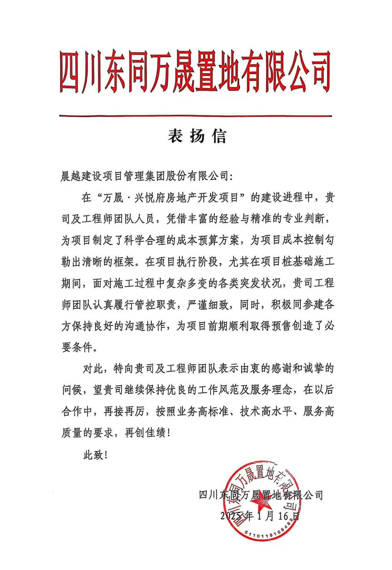 【項目動態】集團收到四川東同萬晟置地有限公司發來的《表揚信》