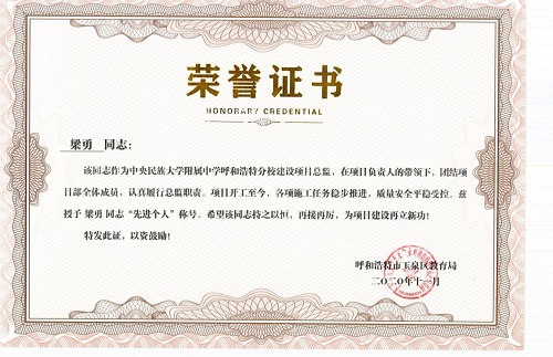 2020年,梁勇受集團委派,擔任集團中央民族大學附屬中學呼和浩特分校建設項目總監(jiān)。該項目交工日期2021年8月10日,是呼和浩特市重大項目,期間包括一個冬施期,時間緊、任務重,梁勇深感責任重大。