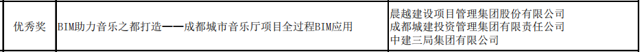 2021年9月28日,中國圖學學會公布了2021年第十屆“龍圖杯”全國BIM(建筑信息模型)大賽的獲獎名單,晨越建管集團 “BIM助力音樂之都打造——成都城市音樂廳項目全過程BIM應用”榮獲綜合組優秀獎項。
